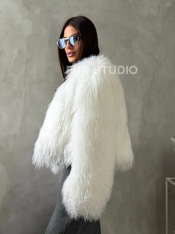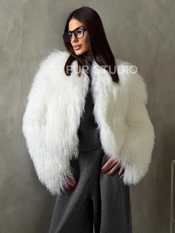 Белая кроп-шуба из меха ламы 102778