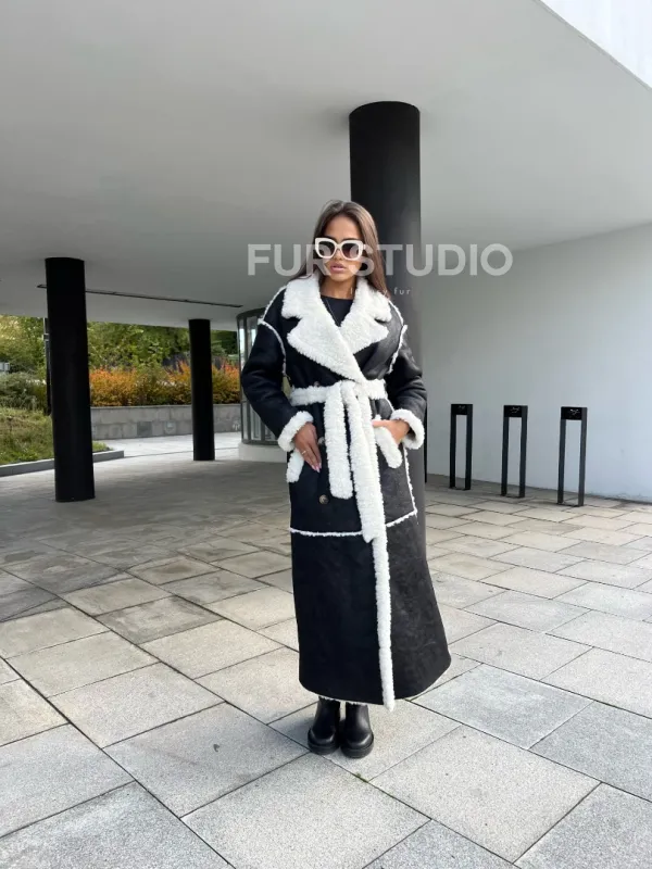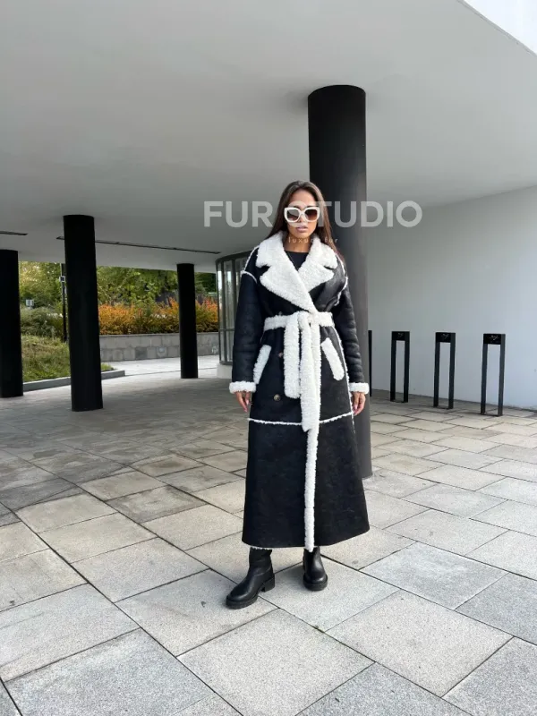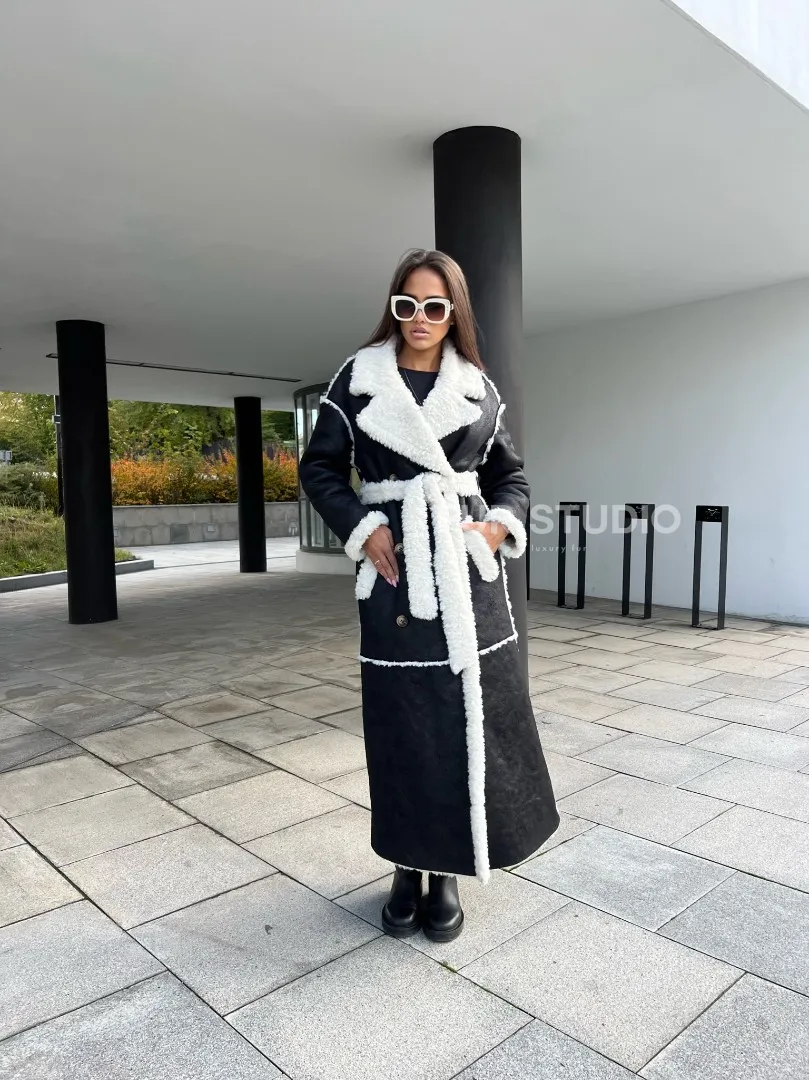 Черная дубленка из экокожи – выбор девушек с изысканным вкусом. Экокожа прекрасная альтернатива натуральной для тех, у кого ограничен бюджет. Длина изделия прикрывает все части тела, что идеально для любительниц голых ножек в холодное время года. Прямой крой зрительно увеличивает рост. Оригинальный пояс подчеркивает талию и создает силуэт фигуры «песочные часы».