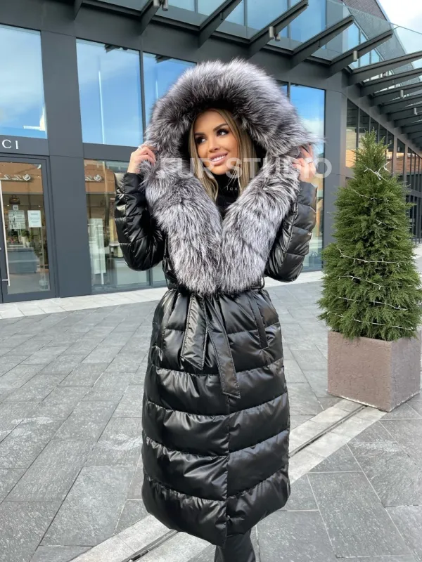 Чёрное пуховое пальто с меховым капюшоном 100223