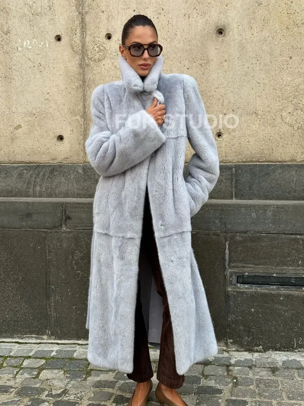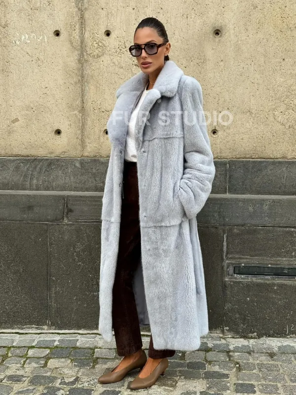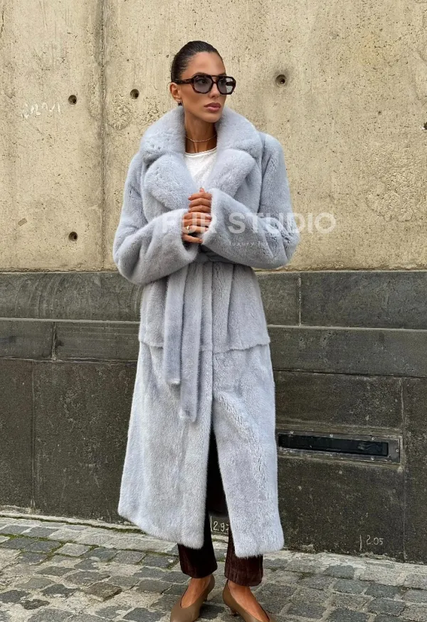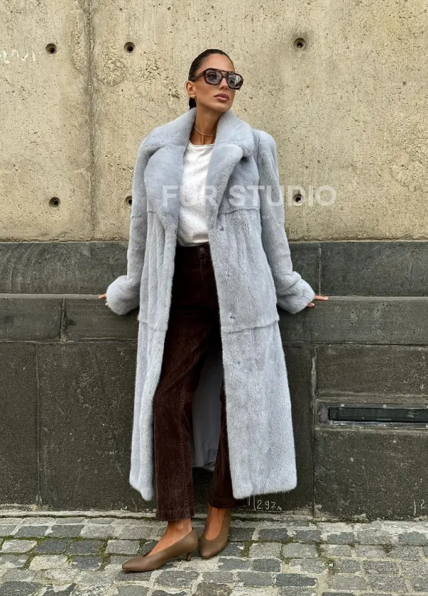 Мех данной шубы аукционная норка, цвет голубой. Предлагается в размерах от 42 до 52. Длина модели 115-120 см, что выгодно подчеркивает фигуру девушек. Эта модель идеально подойдет для девушек и женщин, предпочитающих роскошные натуральные меха.