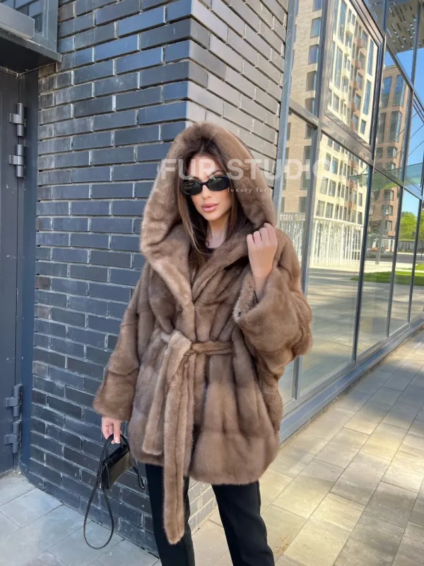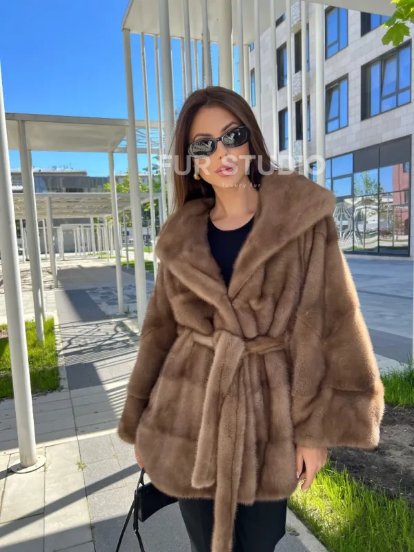 Норковое пончо с капюшоном в цвете пастель 100129