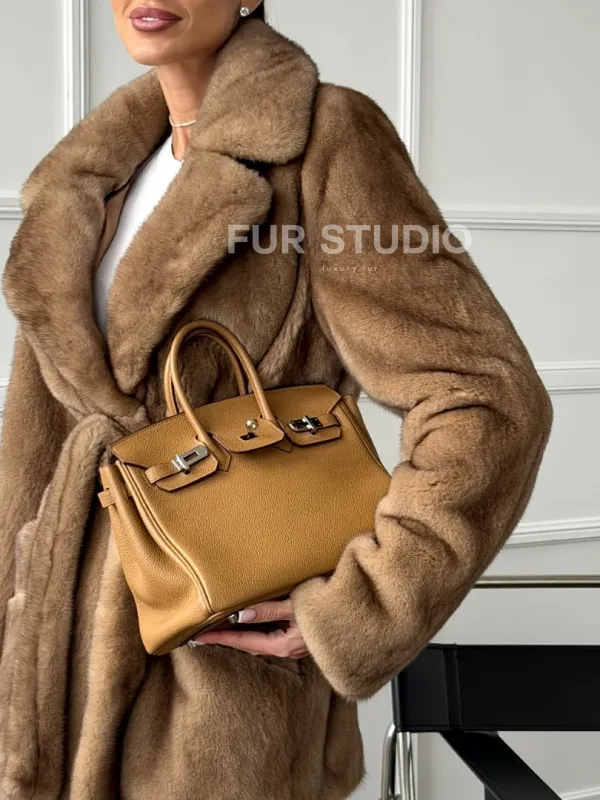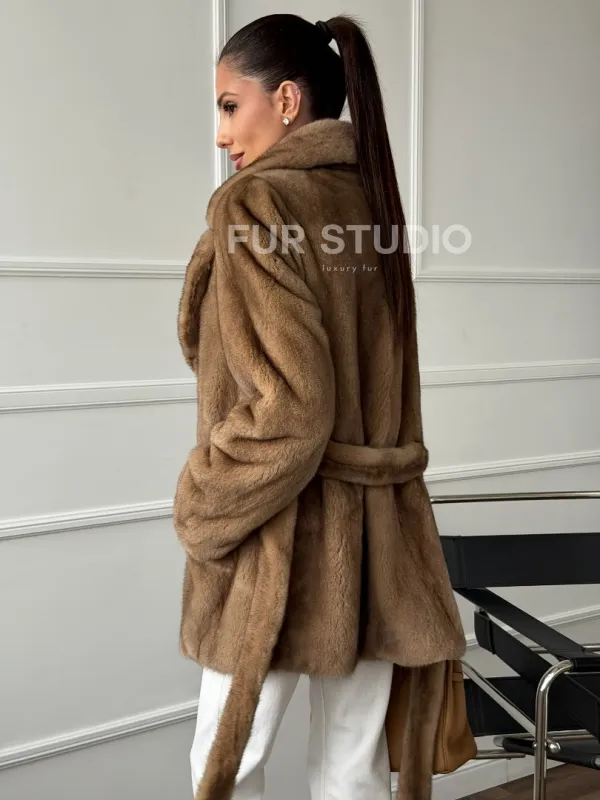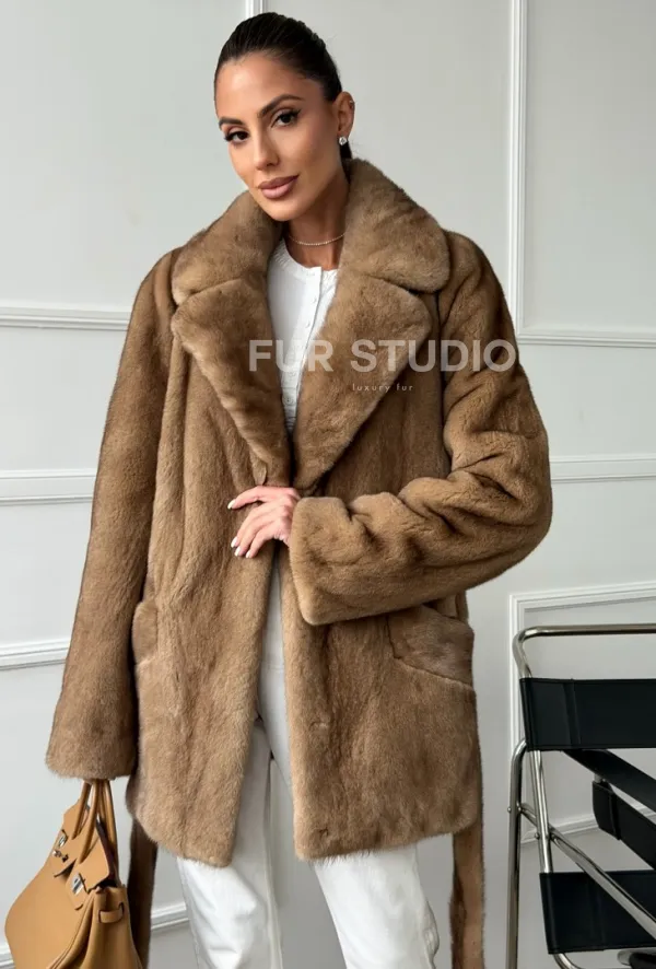 Полушубок норковый пастель с меховым поясом 102664