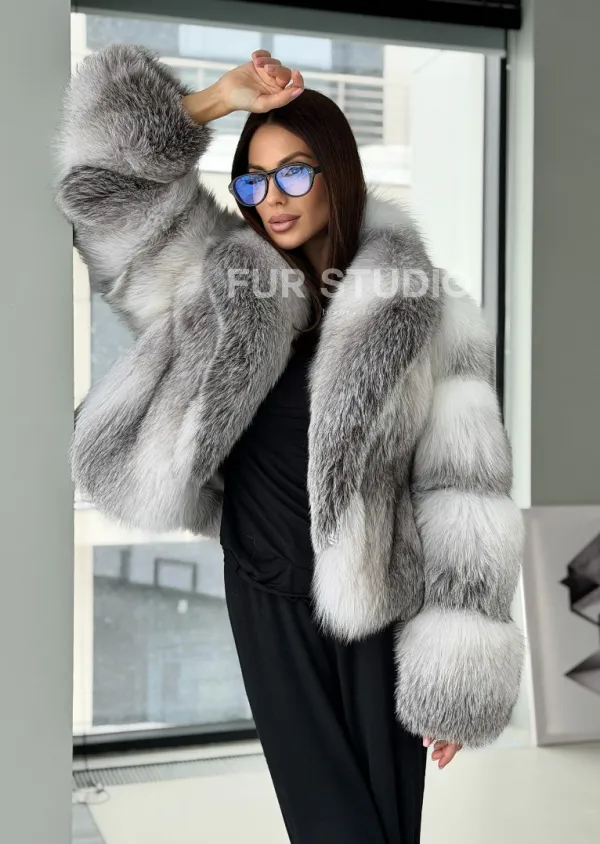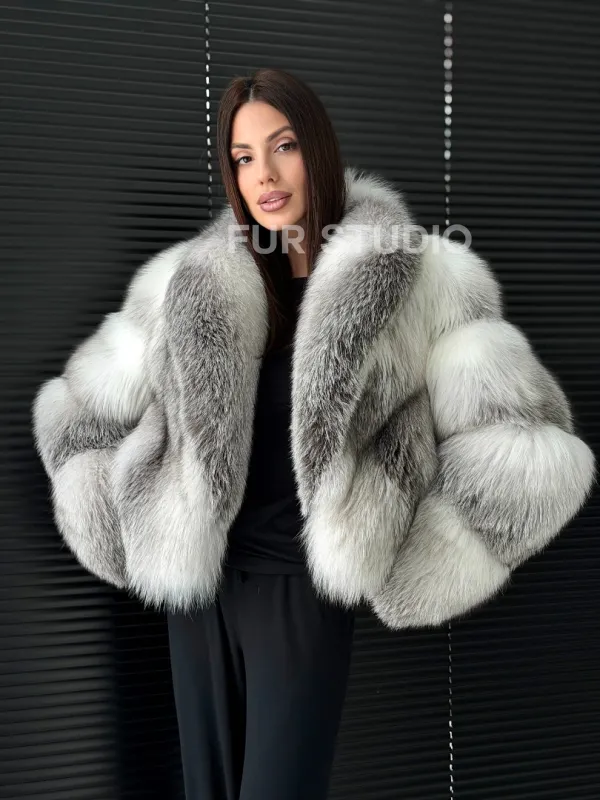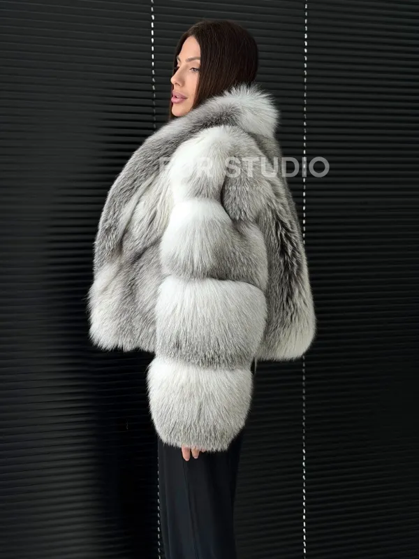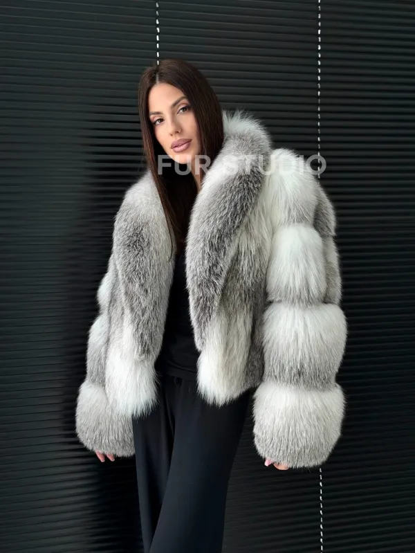 Мех данной шубы лиса, цвет белый. Предлагается в размерах от 42 до 50. Длина модели 55-60 см, что выгодно подчеркивает фигуру девушек. Эта модель идеально подойдет для девушек и женщин, предпочитающих роскошные натуральные меха.