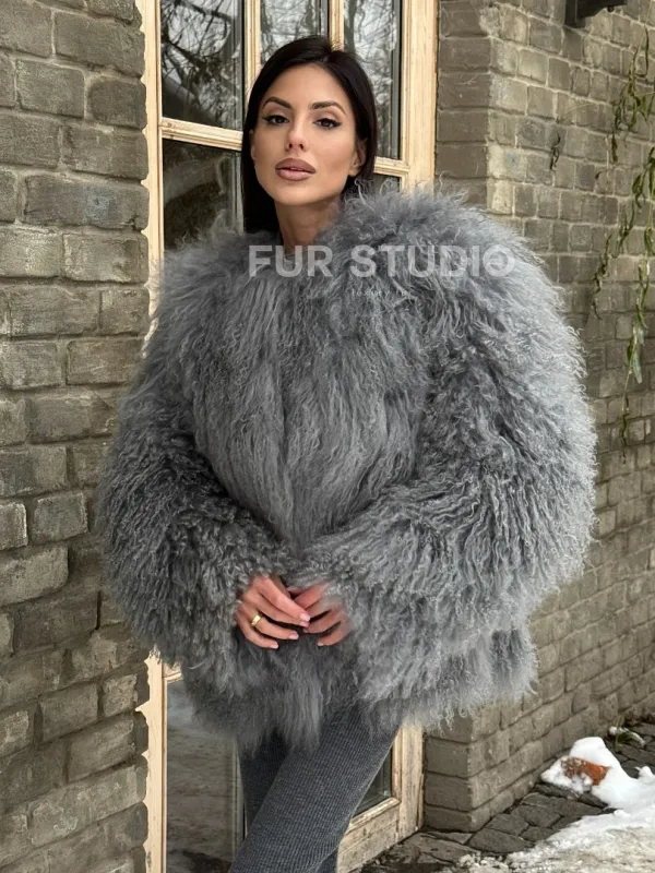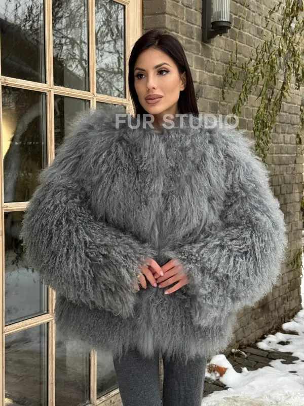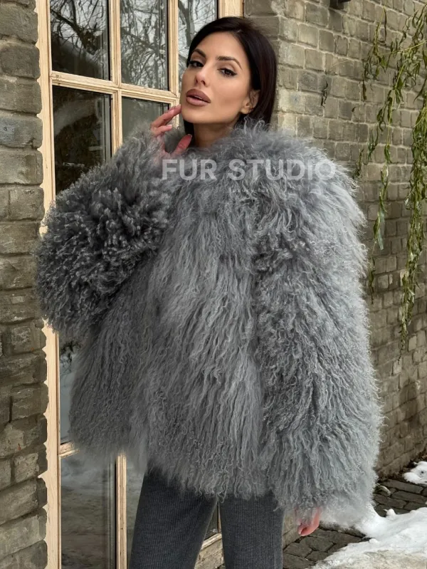 Шуба из меха ламы серого цвета 101435