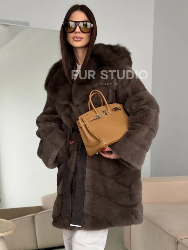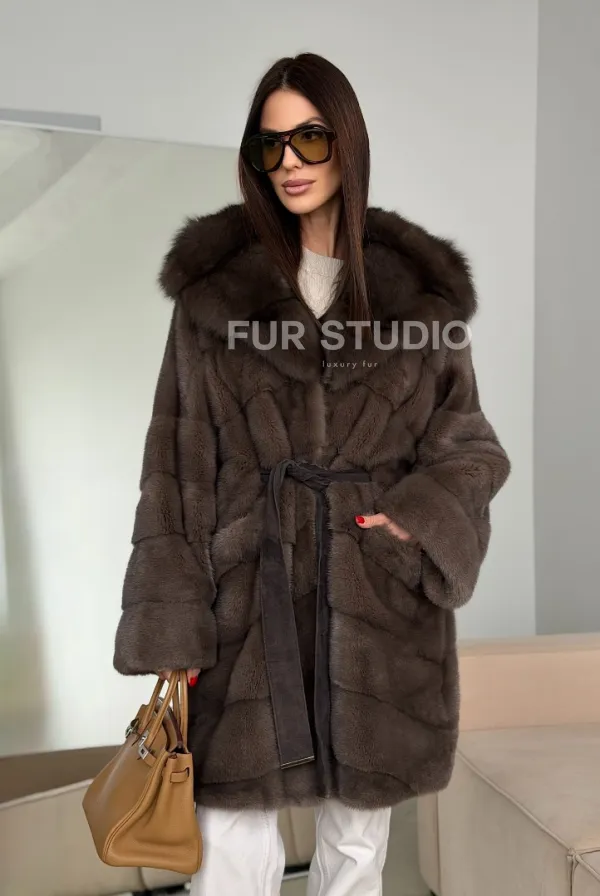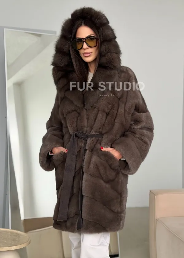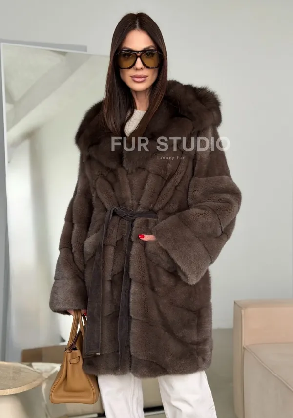 Шуба норковая с капюшоном из куницы 102786